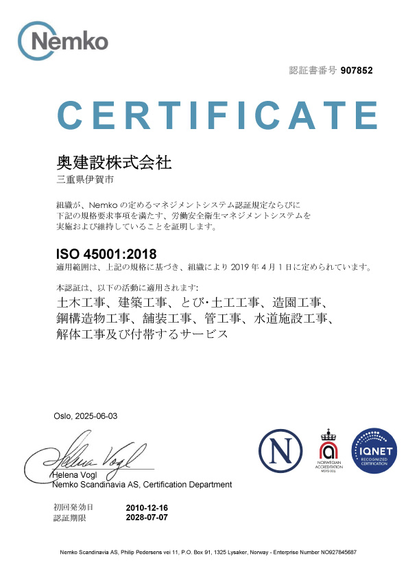 | 2010年12月16日(平成22年) | ISO45001(労働安全衛生マネジメントシステム)認証取得 |